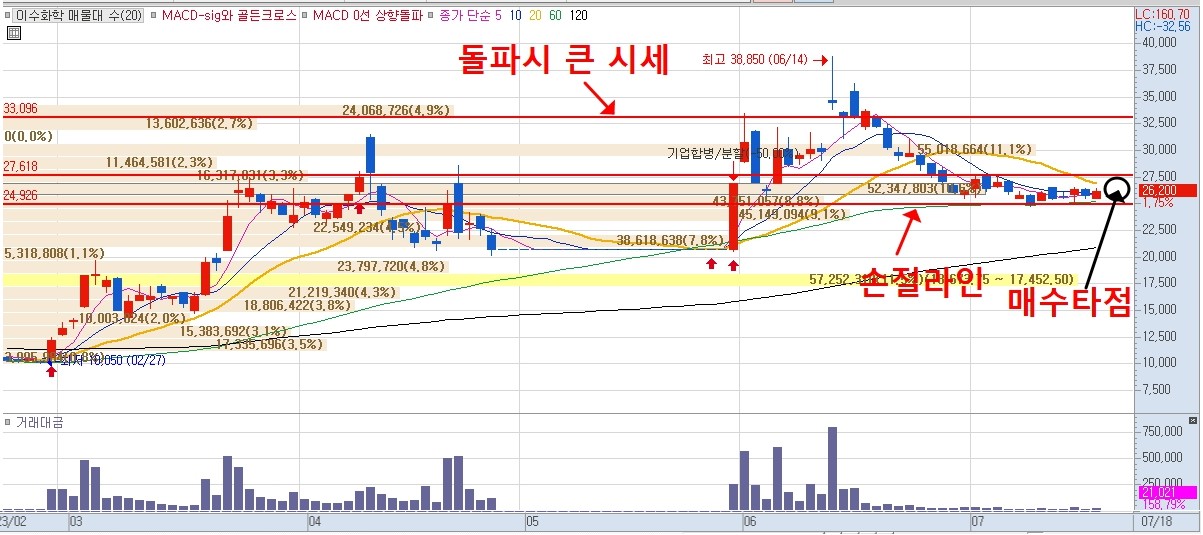 이수화학 일봉 차트를 살펴보면 주가는 올해 3월부터 저점을 높여가는 우상향 추세를 유지하고 있으며 최근 24,900원 대에 지지라인을 만들어 주고 있는 모습입니다.