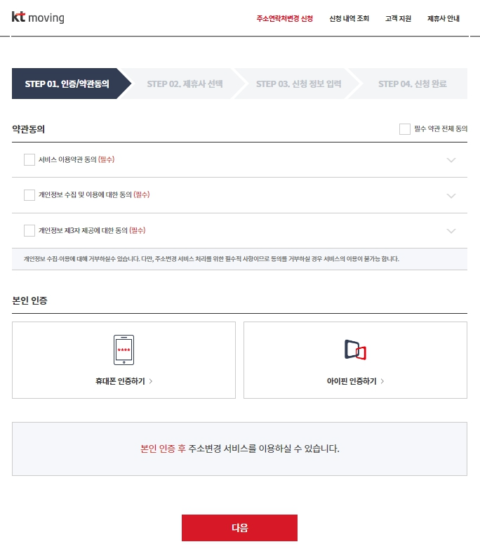 KT 무빙 사이트에 접속하신 후 휴대폰 인증하기, 아이핀 인증하기 등 본인인증과 약관 동의 체크 후 다음버튼을 눌러줍니다.