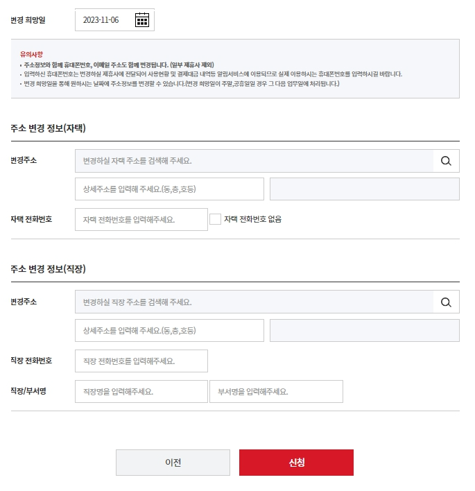 주소변경정보를 입력하신 후 신청버튼을 선택합니다. 무료서비스이기 때문에 부담 없이 신청하셔서 우편물 주소변경을 할 수 있습니다.