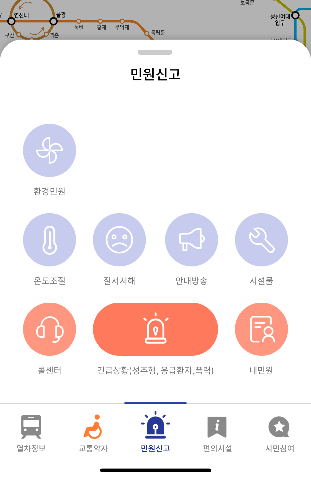 지하철로 이동중인경우 자동으로 현재 내위치정보가 셋팅됩니다. 신고 유형을 확인 후 덥다 ,춥다 중 선택하신 후 민원신고 버튼을 눌러줍니다.