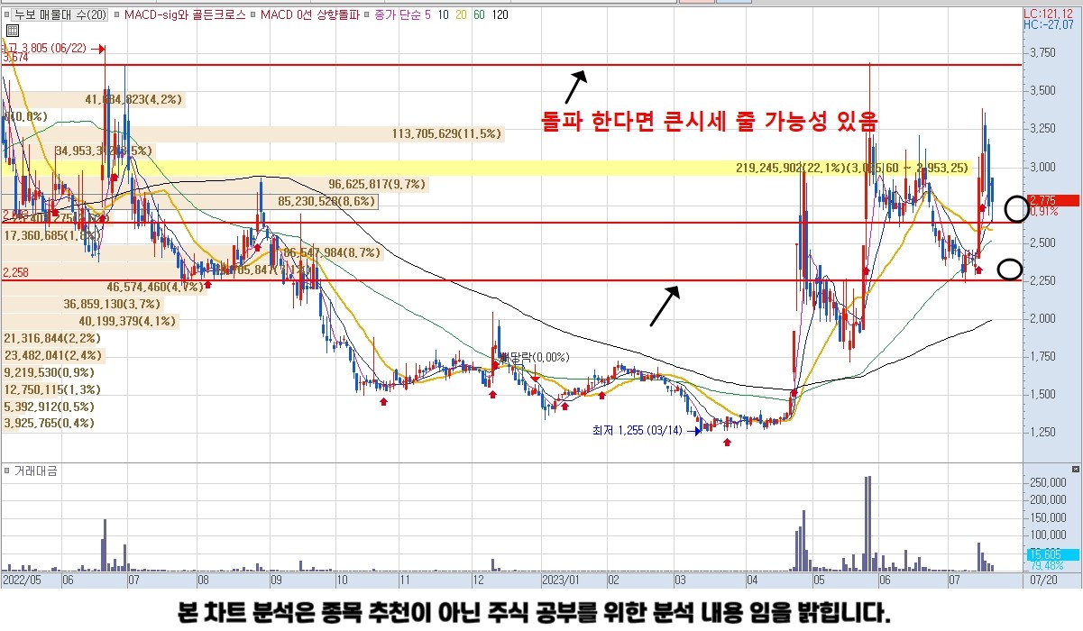 누보의 경우 2650원 구간에서 지지를 기대하고 1차 매수를 해볼 수 있을 것 같으며 하락시 2250원 부근에서 2차 매수를 한번더 해보는 매매 전략을 생각해 볼수 있을 것 같습니다.