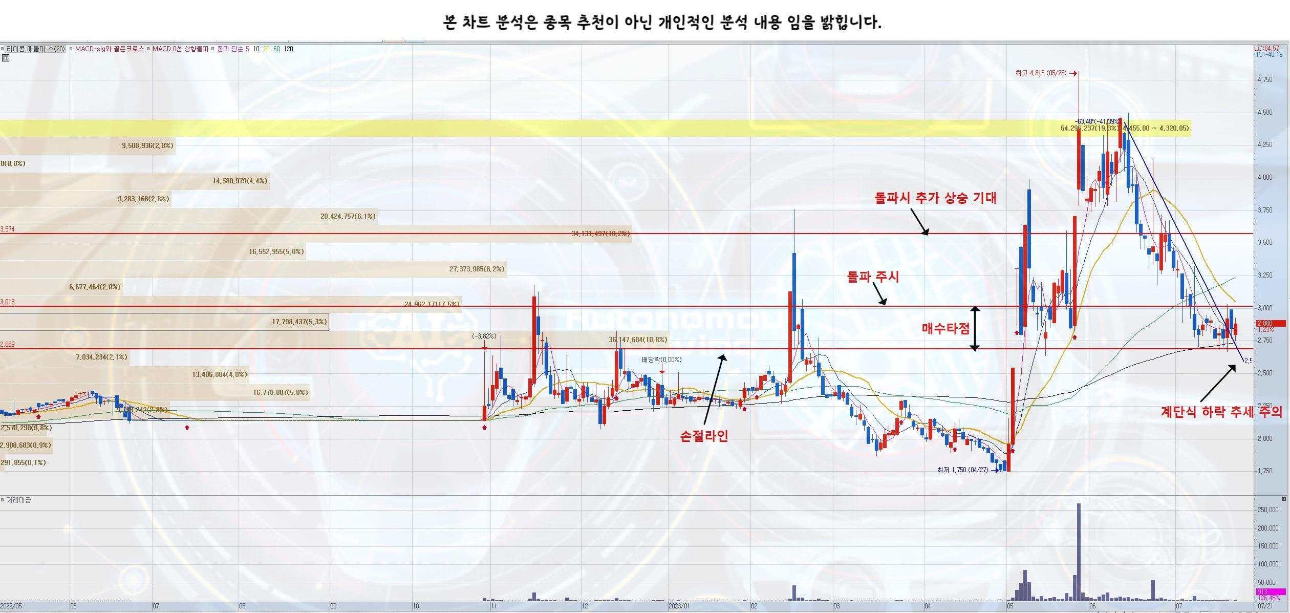 하지만 이후 다시 저 시총주답게 급락세로 반전하며 현재 주가 구간인 3010원 ~ 2689원 구간에서 잠시 단기 박스권을 만들어 주고 있는데 해당 구간을 주요 매수 타점으로 잡아 볼 수 있을 것으로 생각됩니다.