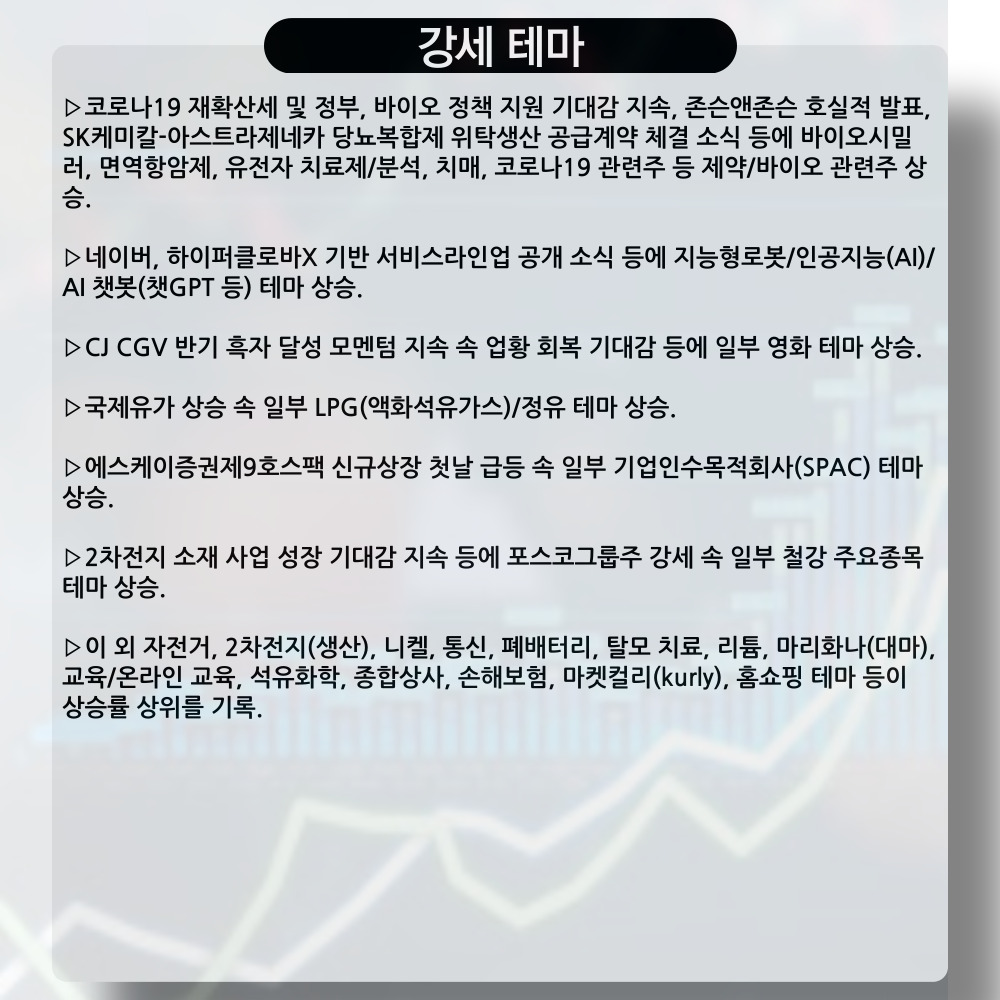 오늘 시장에서는 2차전지 관련주를 비롯한 제약 / 바이오, 인공지능/ai 관련 섹터들이 주로 강세를 이루었고 테슬라가 자율주행 소프트웨어 라이선스를 다른 완성차 기업과 공유하는 것을 협상 중이라는 소식에 자율주행 관련주들이 시장에서 관심을 받고 있는 듯합니다.
