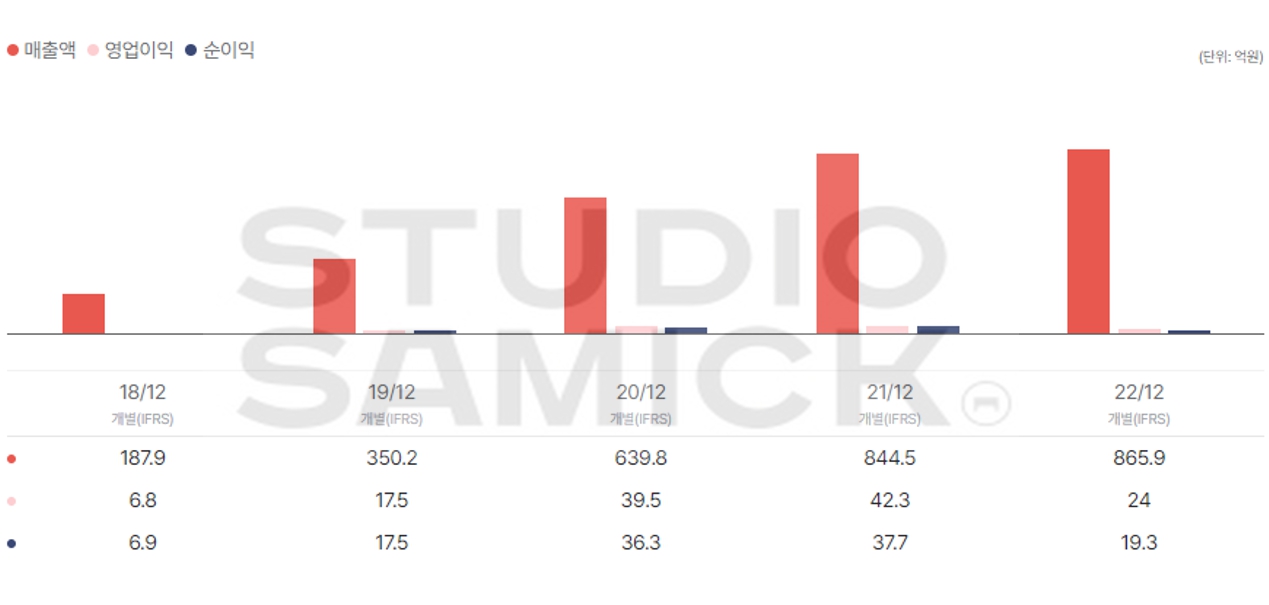 2022년도 스튜디오삼익의 실적을 살펴보면 매출액이 865억 원, 영업이익은 23억 원을 기록했습니다.