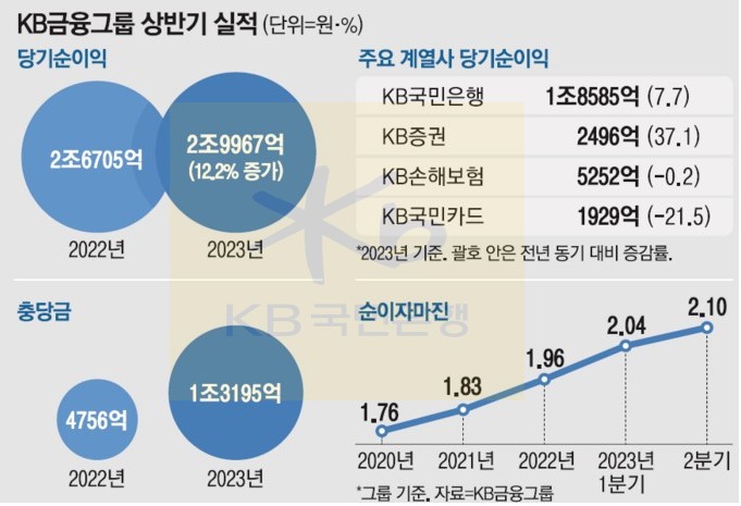 NH투자증권은 KB금융에 대해 2분기 지배 순이익은 1조 4,991억 원 (+23.9%)로 시장 컨센서스를 상회했다며 , NIM이 전분기보다 6bp 상승한 데다 비이자이익이 크게 개선 (1.3조 원, +152.7%) 되면서 양호한 실적을 시현했다고 분석하였습니다.