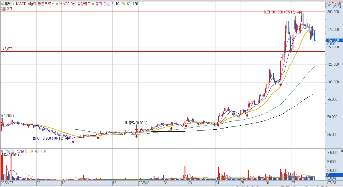 최근 6월부터 143000원과 200,000원 구간 사이에서 잠시 쉬어가는 모습을 보이고 있는데 해당 구간에서 횡보를 보인 후 다시 2000,000원 구간을 돌파한다면 에코프로처럼 추가적인 상승을 기대해 볼 수 있지만