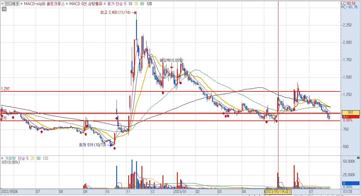 글로벌 세아가 유증 3자배정에 참여했다는 이슈로 5월 6월 상한가까지 기록했던 인디에프 주가는 잏 주요 지지선인 983원까지 이탈하고 전저점인 880원 부근에 주가는 위치하고 있습니다.