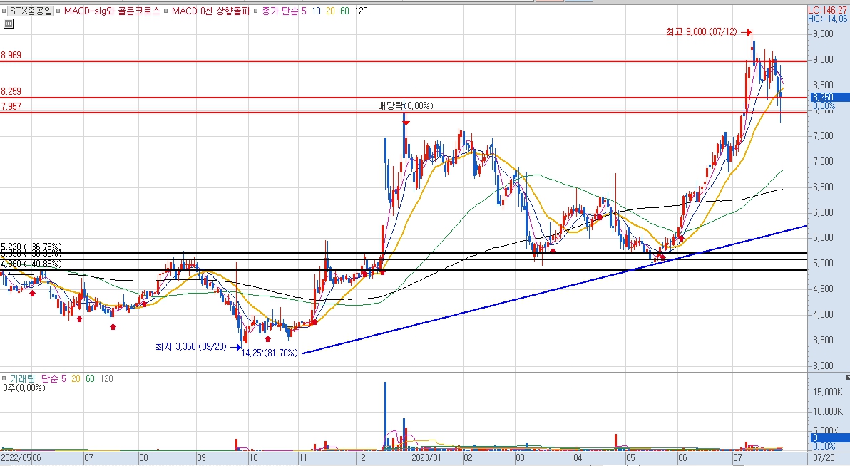 STX 중공업 주가 전망을 위해 일봉차트를 분석해 보면 2022년 11월부터 큰 조정 파동을 일르 크며 우상향 추세의 주가 흐름을 만들어 가고 있는 모습입니다.