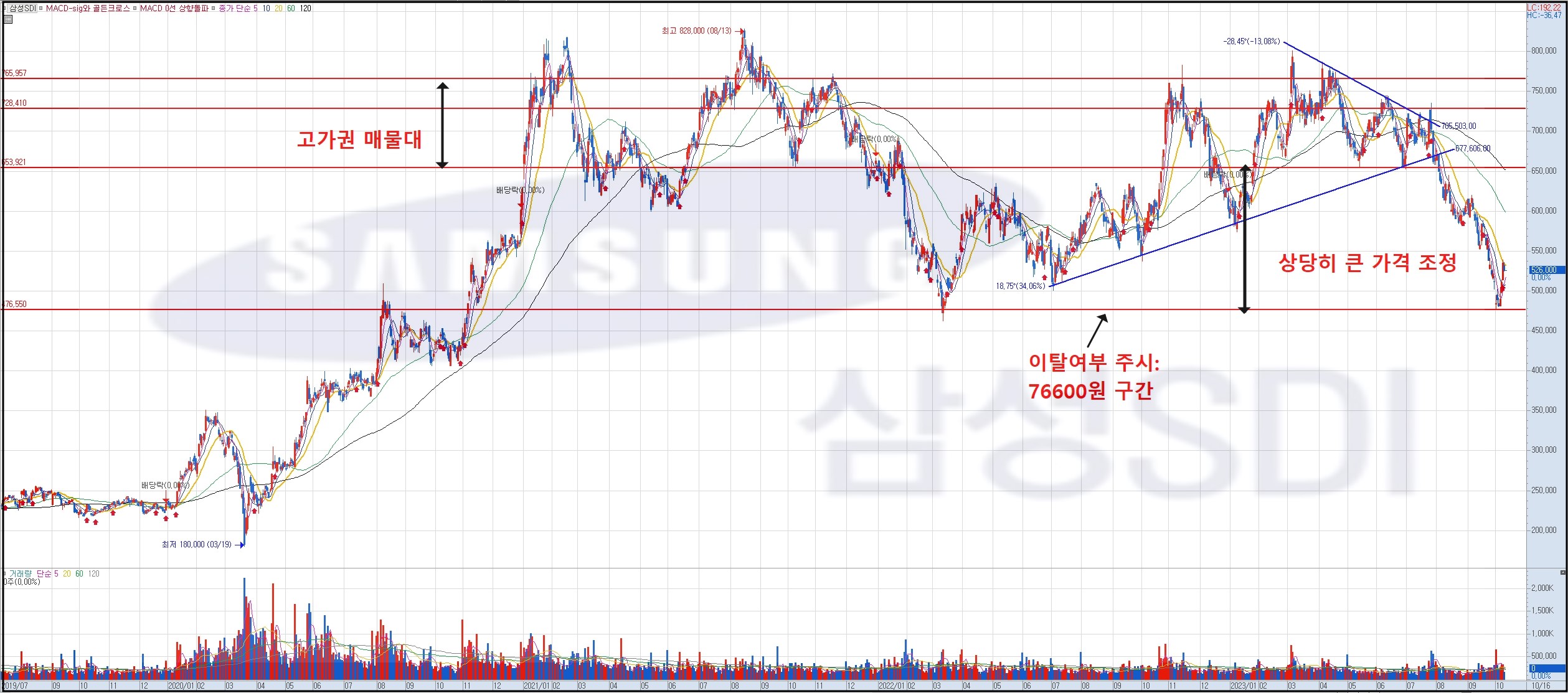 삼성SDI의 일봉 주가 차트를 살펴보면 2020년 급등세를 보여주고 최근 까지 고가권에서 횡보 구간을 잘 이어온 것으로 보여 집니다.