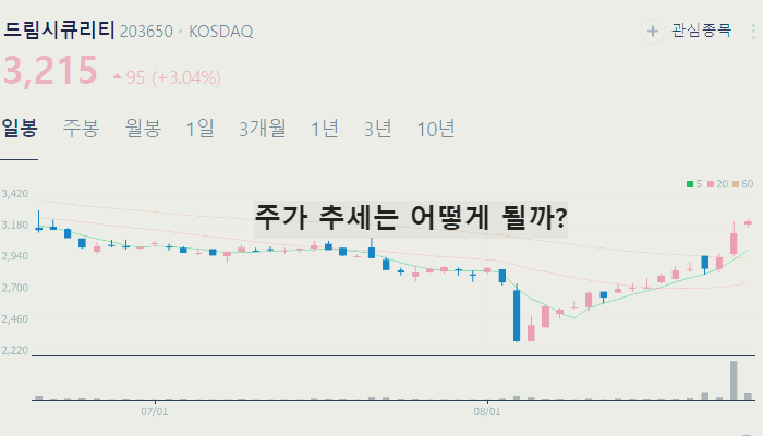 개인적으로 큰 상승이 기대되는 드림시큐리티 주가는 2024년 8월 28일 기준 3215원입니다.