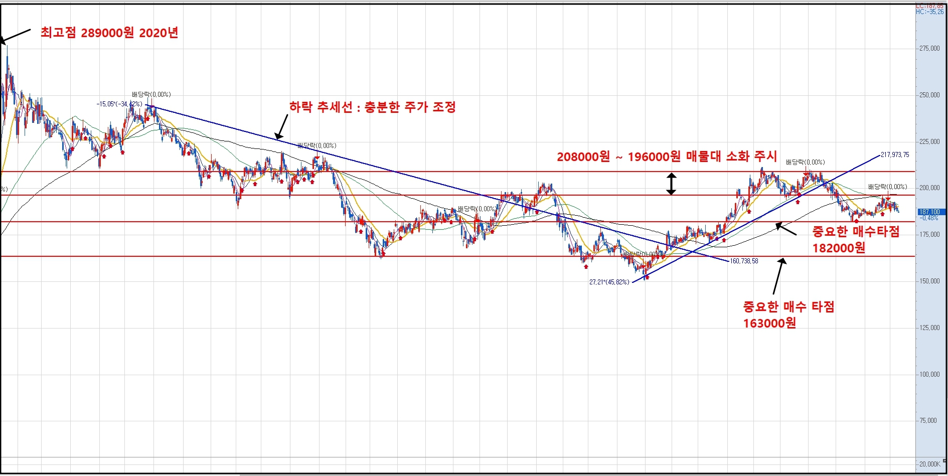 신규 진입시 182000원 구간과 163000원 구간을 주요 매수 타점으로 분할 매수로 접근 하는 전략이 필요해보이며 208000원 ~ 196000원 구간의 매물대를 소화해 내는지 주요 체크포인트가 되겠습니다.