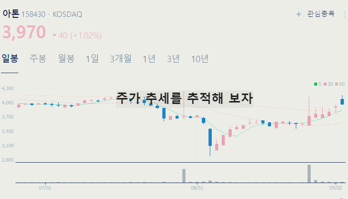 개인적으로 큰 상승이 기대되는 아톤 주가는 2024년 9월 3일 기준 3970원입니다.