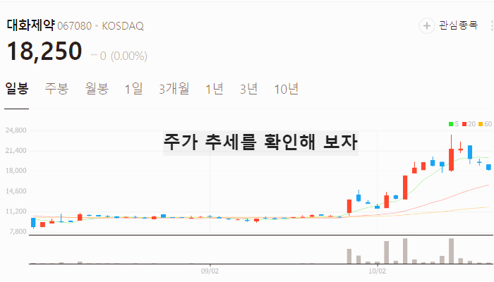향후 주가 상승이 기대되는 대화제약 주가는 (10월26일) 기준 18250원입니다.