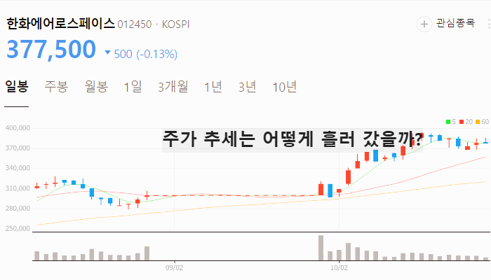 향후 주가 상승이 기대되는 한화에어로스페이스 주가는 2024년 10월 29일 기준 377500원입니다.
