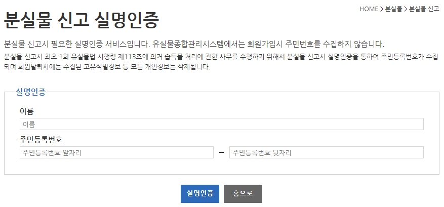 실명인증을 완료 하면 아래와 같은 화면에서 분실문 접수가 가능합니다.