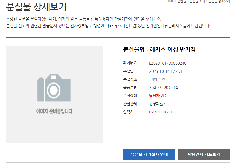 해당 사이트에서 분실한 물건의 사진과 보관장소, 습득일 등에 대한 자세한 정보까지 확인해보세요.