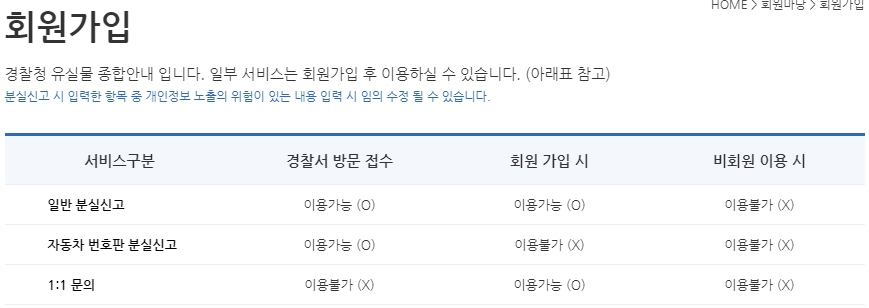 경찰서에 방문할 경우와 회원가입,비회원 이용시에 이용할수 있는 메뉴가 있기 때문에 현재 접수하려는 상황에 맞게 회원가입 하거나 직접 방문하여 접수를 선택할 수 있습니다.