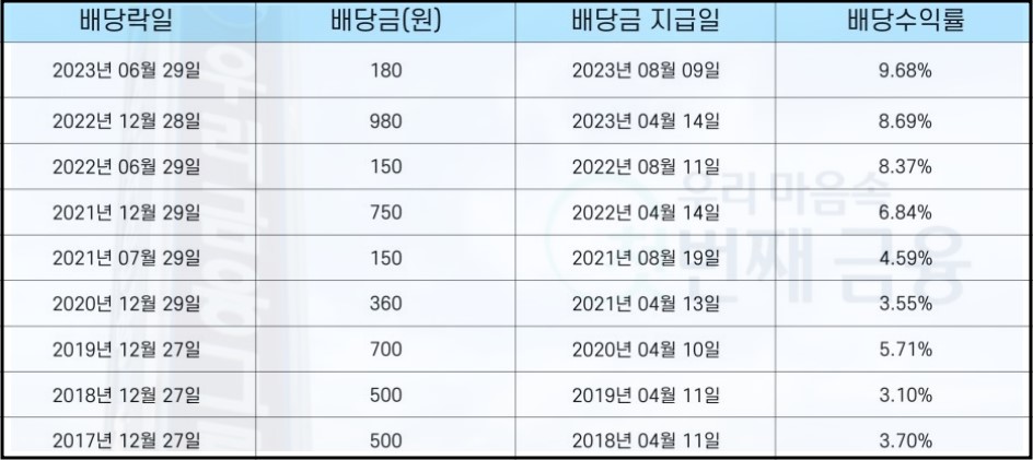 2023년 2분기 배당금은 180원으로 배당수익률 9.8%를 기록 , 배당락일 2023년 6월 29일 , 배당금 지급일은 2023년 08월 09일에 실시하였기에 다음 3분기 와 4분기 배당을 노리며 매매를 해볼수 있을 것으로 생각 됩니다.