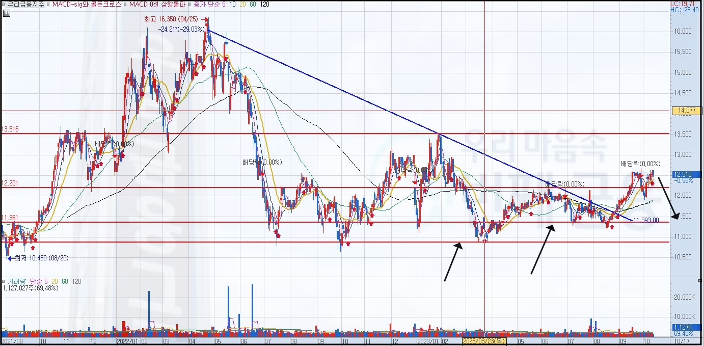 우리금융지주 주가는 2022년 고금리 상황으로 수급이 일부 붙으며 고점인 16350원을 기록하고 2022년 06월 급락한 이후 지속적인 횡보 흐름을 보여 주고 있습니다.