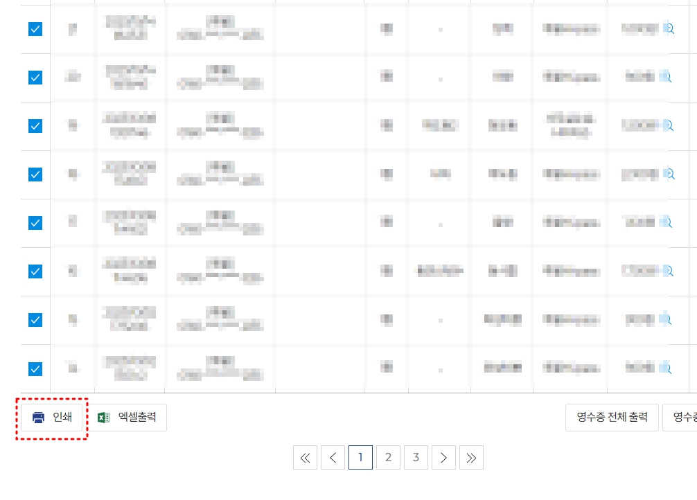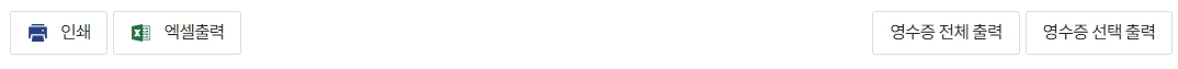 영수증 출력을 원할 경우 아래 영수증 전체 출력, 영수증 선택 출력 버튼을 눌러줍니다.