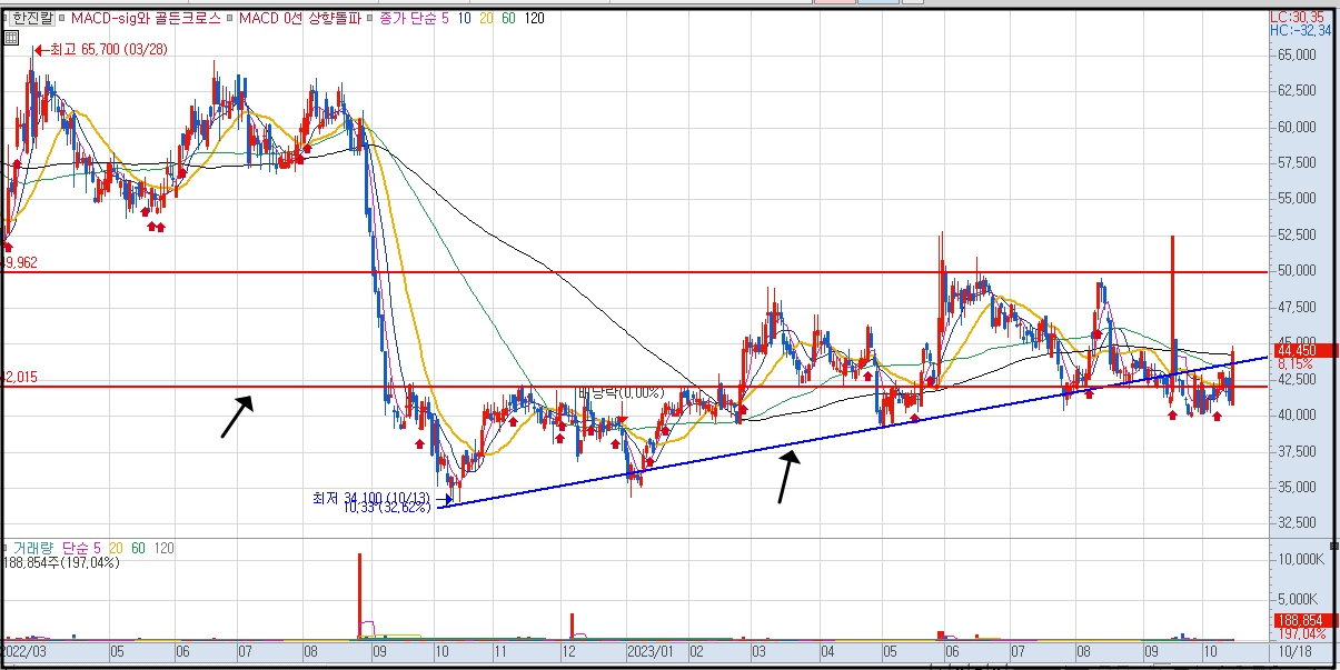 한진칼 주가 전망을 분석하기 위해 일봉 차트를 살펴 보면 2022년 급락세를 보여준 한진칼 주가는 이후 일정 구간 우하향 추세를 보여주다가 오늘 팬오션의 한진칼 지분매도 소식이 나왔지만 오히려 8%대의 급등세를 보였습니다.