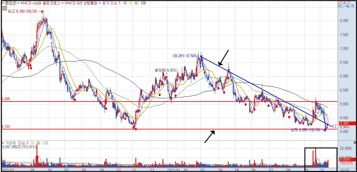 팬오션 주가 전망을 분석 하기 위해 일봉 차트를 살펴 보면 팬오션 주가는 2021년 부터 주기적으로 큰 파동을 하나 씩 만들며 중장기적인 우하향 추세를 만들어 가고 있는 분위기 인데 이번 펜오션 HMM 인수와 관련하여 그렇게 큰 이슈를 만들어 내지 못하고 있습니다.