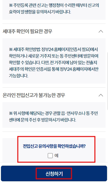 전입신고 유의사항 예 체크 후 신청하기를 눌러줍니다.