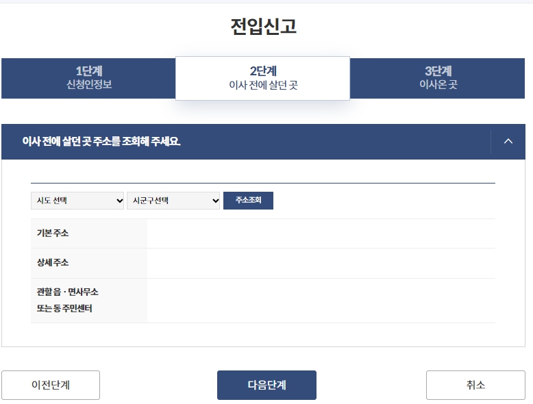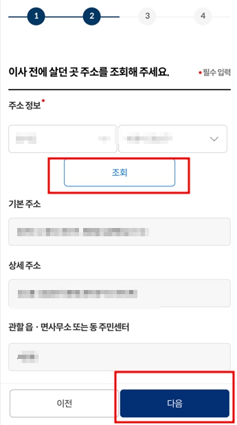 2단계 이전에 살던 주소를 검색한 후 주소조회를 눌러줍니다.