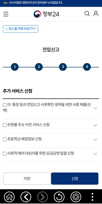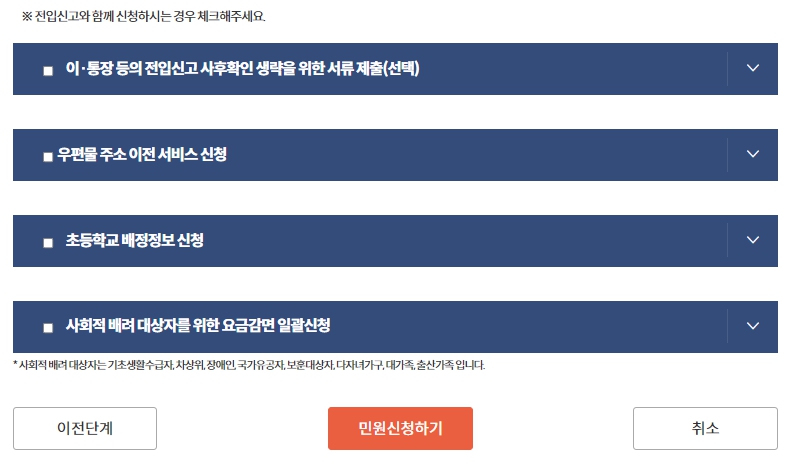 이사온이사 온 사람끼리 세대구성인지 이사 온 곳에 기존 세대주가 있는지 선택한 후 다음버튼을 눌러줍니다. 빈집으로 이사간다고 선택 후 다음을 누르면 추가 서비스 신청 체크메뉴가 나오며 체크사항 확인 후 신청버튼까지 눌러줍니다.