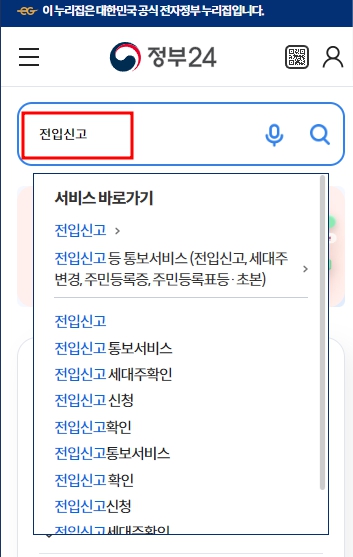 모바일 웹 사이트로 정부 24 방문하신 후 상단 검색창에 전입신고를 입력 후 검색합니다.