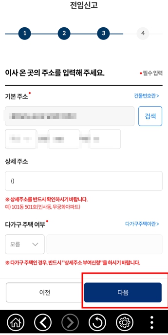 인증이 완료 된 후 이사 가는 사람의 정보를 선택한 후 다음버튼을 눌러줍니다.