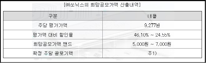 해당 주당 평가액을 참고하여 할인율을 거쳐 산출된 희망공모가는 5,000원 ~ 7000원으로 결정 되었습니다.
