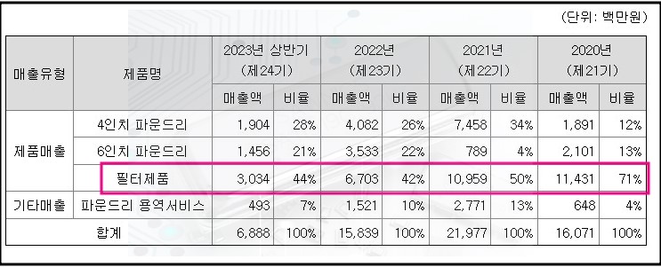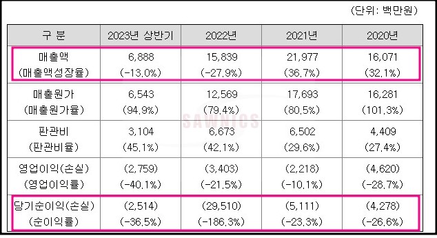 당기순이익은 2020년 4,620 (백만원) , 2021년 5,111 (백만원) , 2022년 29,510 (백만원) , 2023년 상반기 2,514 (백만원)으로 적자를 기록하며 매출폭 또한 감소 추세를 보이고 있습니다.