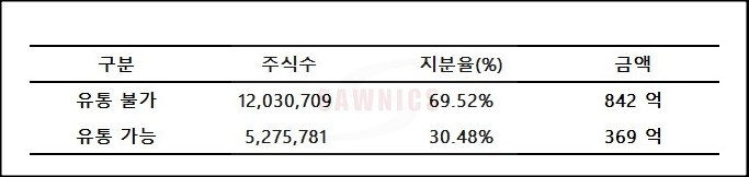 이에 따라 유통 주식수 는 5,275,781주로 30.48%를 차지하고 있으며 금액으로 환산 하면 369억 입니다.