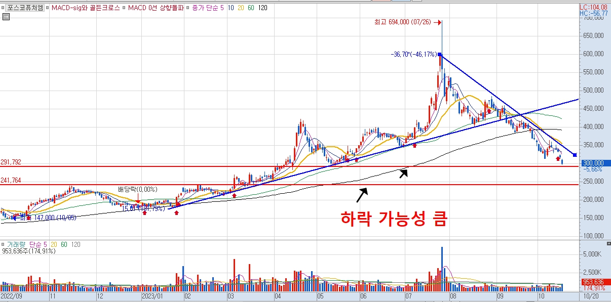 포스코퓨처엠 주가는 현재 300,000원으로 2023년 07월 고점인 694,000원을 리록하고 급락세를 이어 가고 있는데 매우 위험한 차트 위치에 있다고 볼수 있습니다.