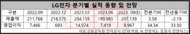 3분기 실적의 경우 주력사업인 가전 , TV 및 자동차 전장 사업의 수익성이 높아 지며 매출은 20조 27139억원(전년동기 대비 2.2% 감소) , 영업이익 9967억원 (전년동기 대비 33.5% 증가) 는 실적을 기록 하였습니다.