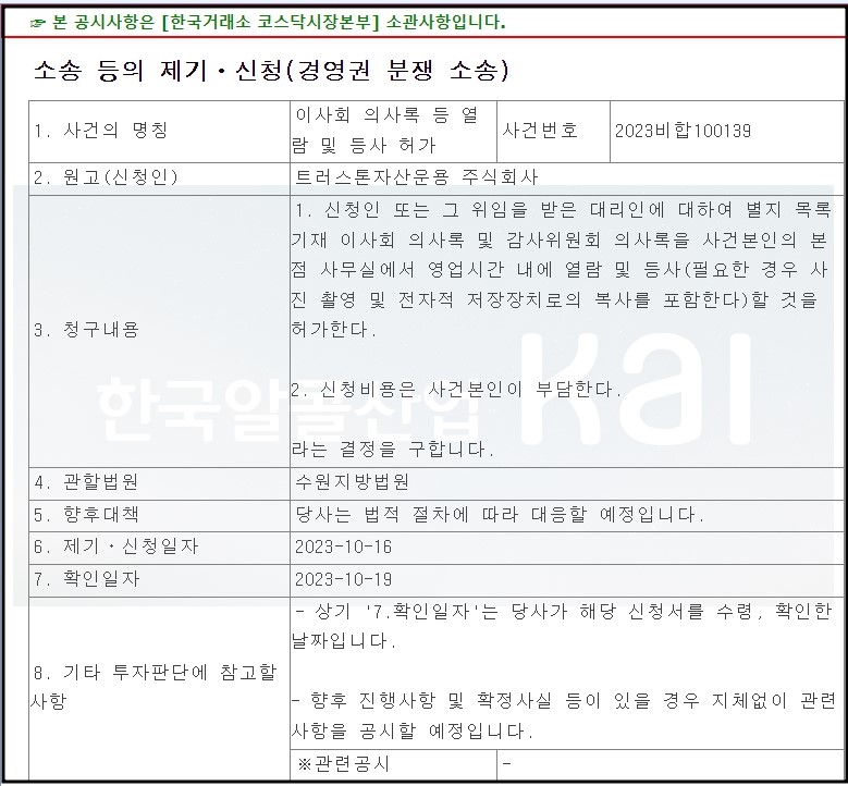 트러스톤자산운용이 수원지방법원에 이사회 의사록 등 열람 및 등사 허가 소송을 제기했기 때문인데