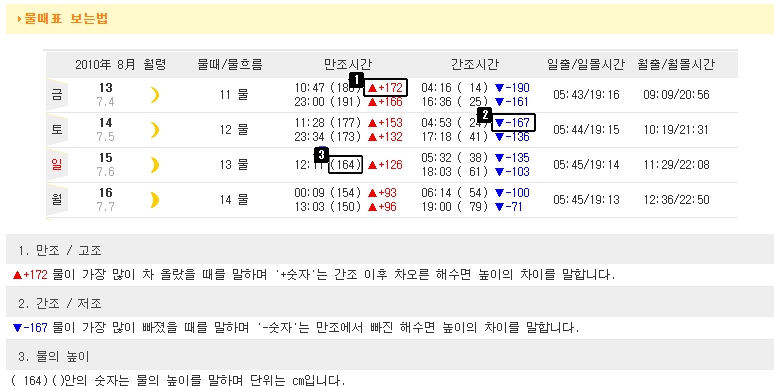 | 조석 | 물이 들어오고 나가는 시작점의(만조, 간조)일별 시간표시 |