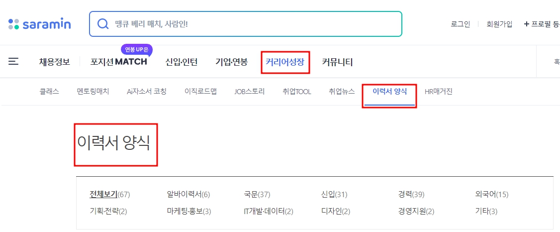 사람인 사이트 메뉴에서 커리성장 메뉴의 이력서 양식을 선택 한후 하단 메뉴에서 다양한 이력서양식을 다운로드 받을 수 있습니다.