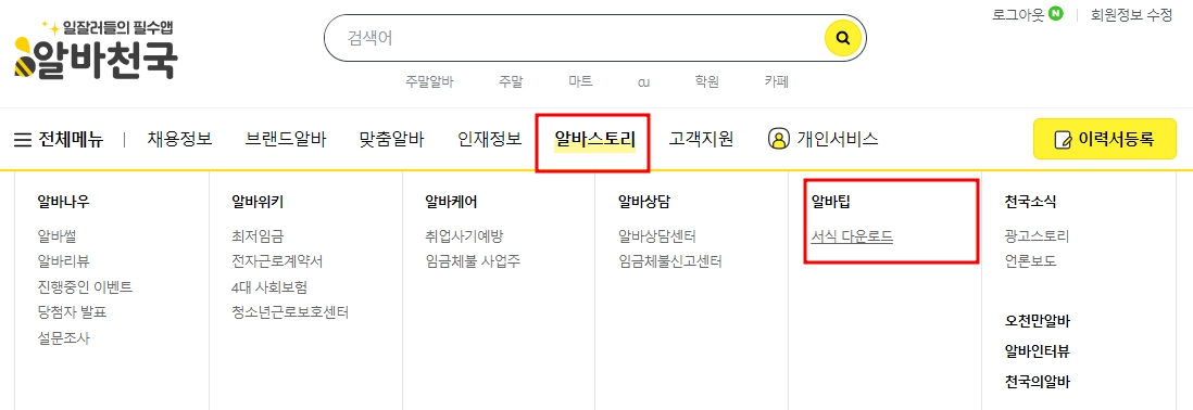 알바천국 사이트에 접속 한 후 회원가입 후 로그인 합니다. 전체메뉴에서 알바스토리 메뉴의 알바스토리 메뉴를 선택합니다.