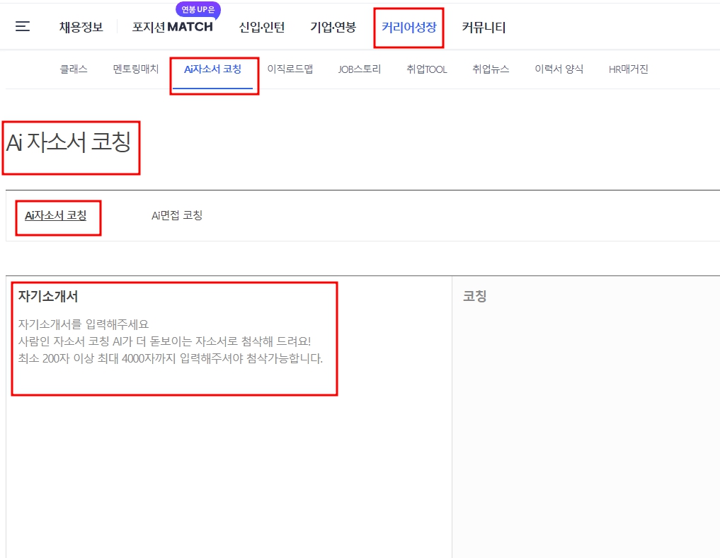 사람인 사이트에서는 AI 자소서 코칭 메뉴를 제공하고 있습니다.