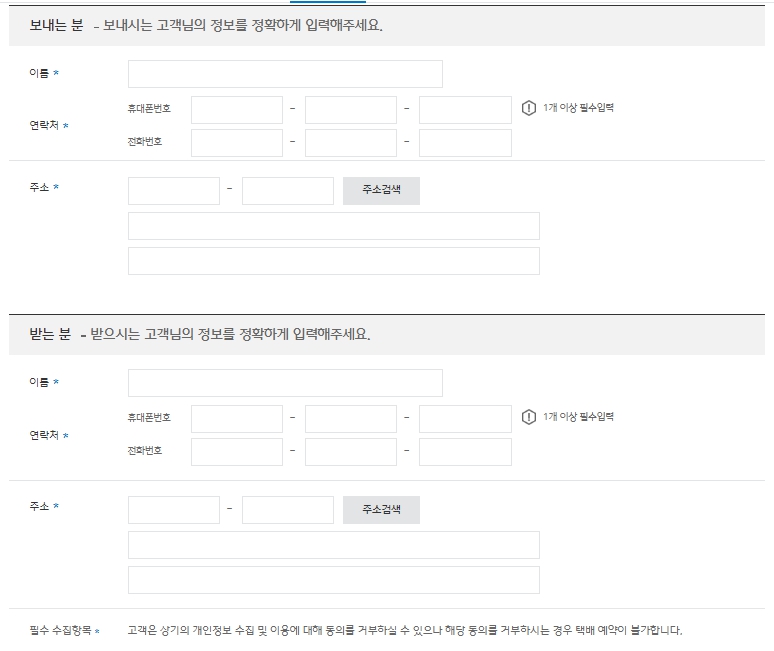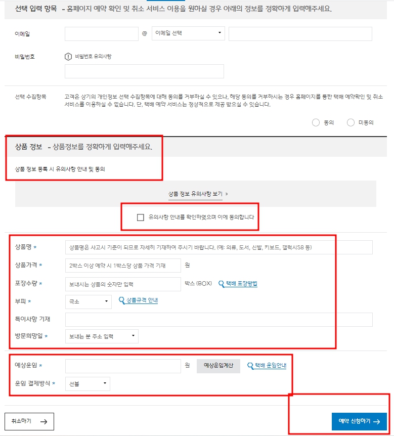 위 네모 친 곳의 필수입력사항들은 모두 입력하신 후 예약 신청하기 버튼을 누르면 택배예약이 완료됩니다.