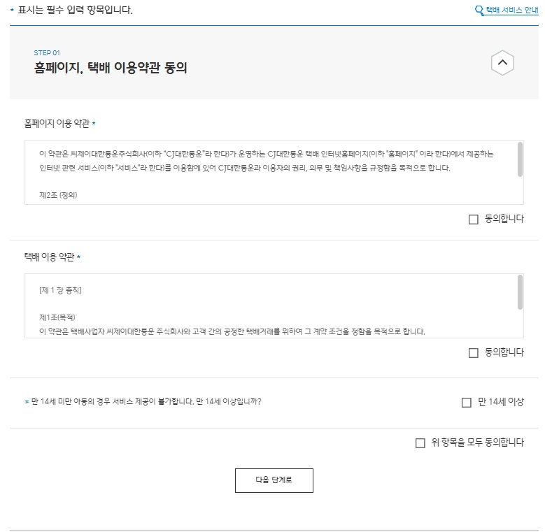 개인택배예약 버튼을 누른 후 이용약관 동의 후 다음단계로 버튼을 눌러줍니다.