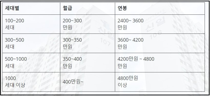 - 500~1000세대 연봉 4200만 원 ~ 4800만 원 수준, 월급으로 환산 시 350만 원 ~ 400만 원