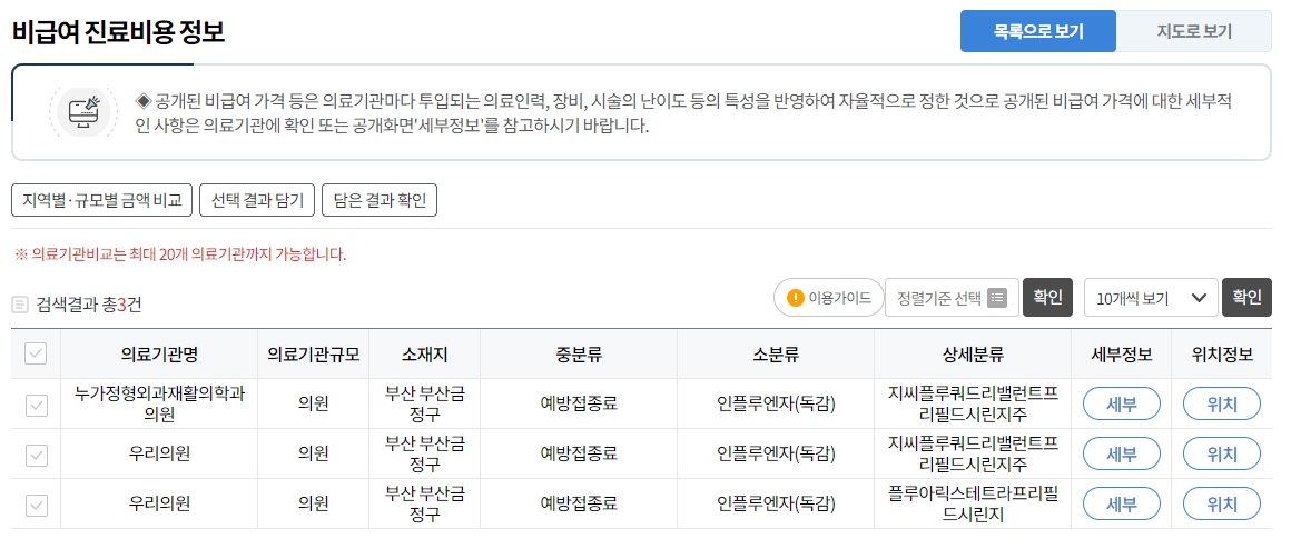 부산 금정구를 예를 들어 검색해 보니 3개의 병원정보를 확인할 수 있습니다.