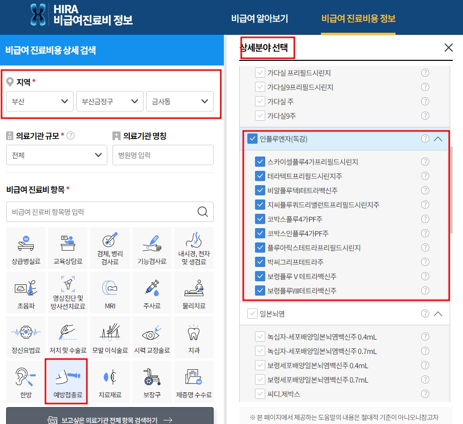 위 화면처럼 상세지역과 비급여 진료비항목을 선택한 후 오른쪽의 상세항목을 선택한 후 선택항목 검색버튼을 눌러줍니다.