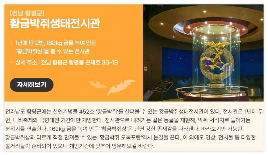 전남 함평군에는 황금박쥐생태전시관이 있습니다. 전시관은 1년에 두 번, 나비축제와 국향대전 기간에만 개방하기 때문에 개방기간에 맞춰 방문하셔서 확인해 보세요.