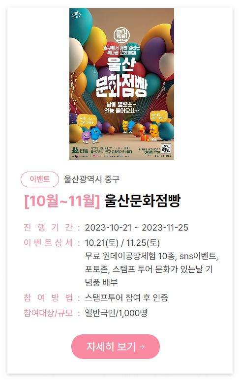 울산광역시 중구에서는 울산문화점방이라는 행사를 10월 21일부터 23년 11월 25일까지 진행합니다. 무료 이벤트가 많으니 자세히 보기 누르신 후 정보를 확인해 보세요.