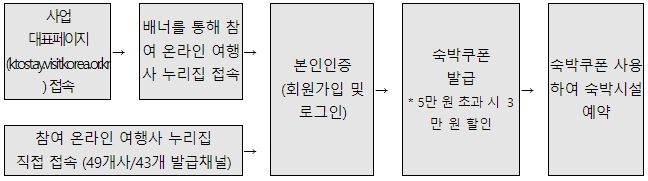 본인인증 (회원가입 및 로그인) 후 숙박쿠폰을 발급합니다.(5만 원 초과 시 3만 원 할인) 숙박쿠폰 사용하여 숙박시설 예약합니다.
