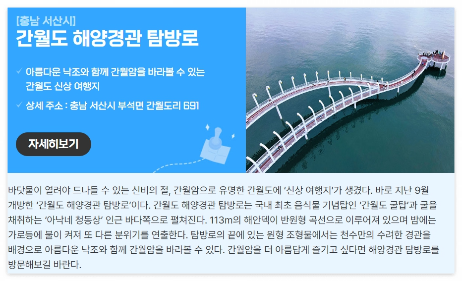 충남 서산시 간월도 해양경관 탐방로 여행정보도 확인해 보시길 바랍니다. 올해 9월 개방한 간월도 해양경관 탐방로를 방문하셔서 아름다운 낙조와 간월암을 확인해 보세요.